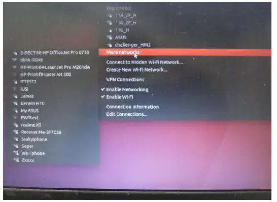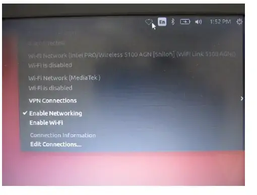 Click WiFi icon on the upper-right corner on Linux and disable WiFi. After disabling WiFi, then enable Wi-Fi, and Wi-Fi Networks (Intel….) and Wi-Fi Networks (MediaTek) would be visible. The Wi-Fi Networks (MediaTek) is device name of EUT.