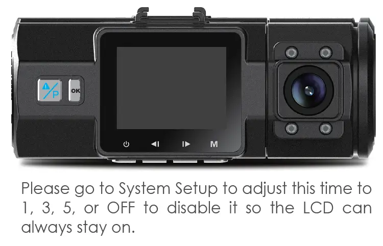 This feature avoids any chance of the screen being a distraction in the vehicle, especially at night when the illumination from the LED screen can be a nuisance or even a hazard to the driver. If you set the Auto LCD Off to 3 minutes, the camera’s LCD will light off after 3 minutes but recording will continue with blue light blinks on the emergency button. You can press any button to light on the screen.