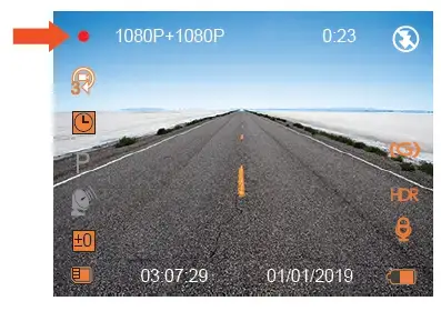 By default (DUAL CAM RECORDING mode), 1080P+1080P resolution will show on the screen, both cameras will capture road front and inside cabin at dual 1920x1080P (30fps).