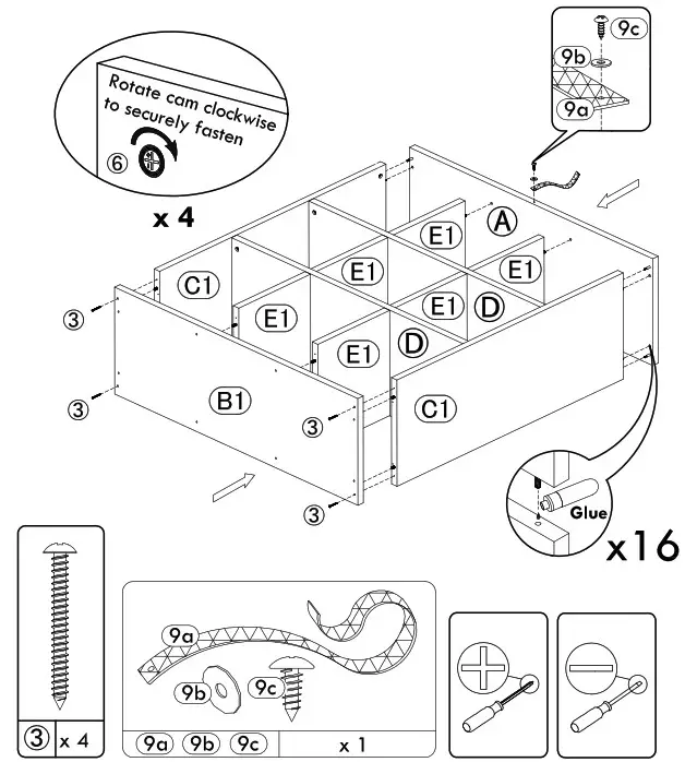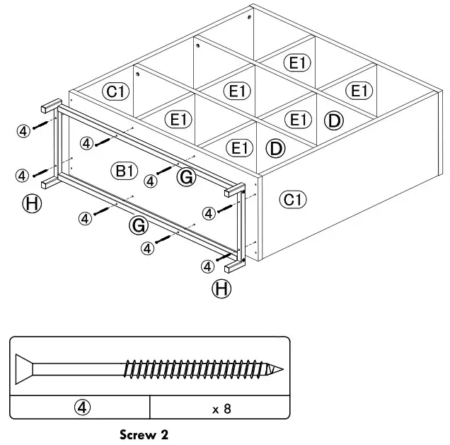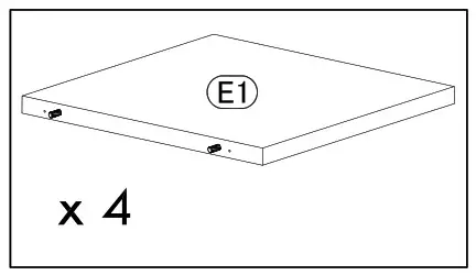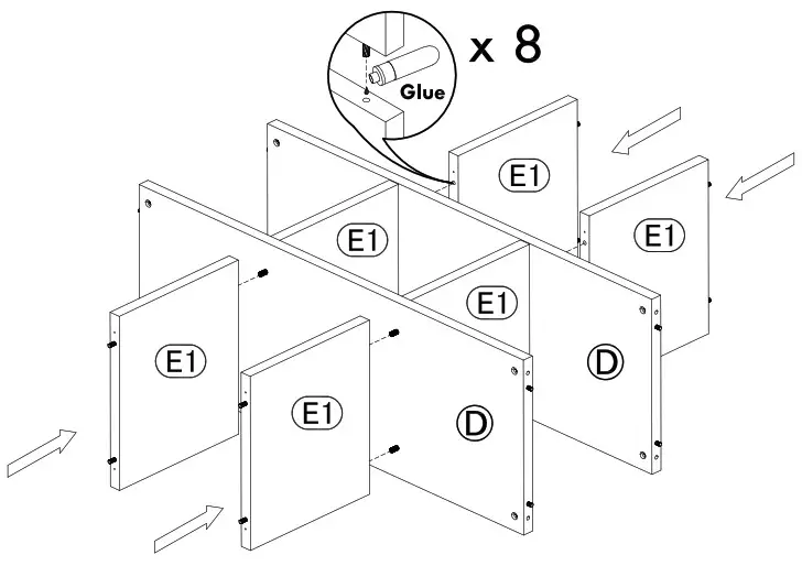 - Align and attach four-part E1 to the shelf as shown. Please pay attention to the direction of dowels on part E1.