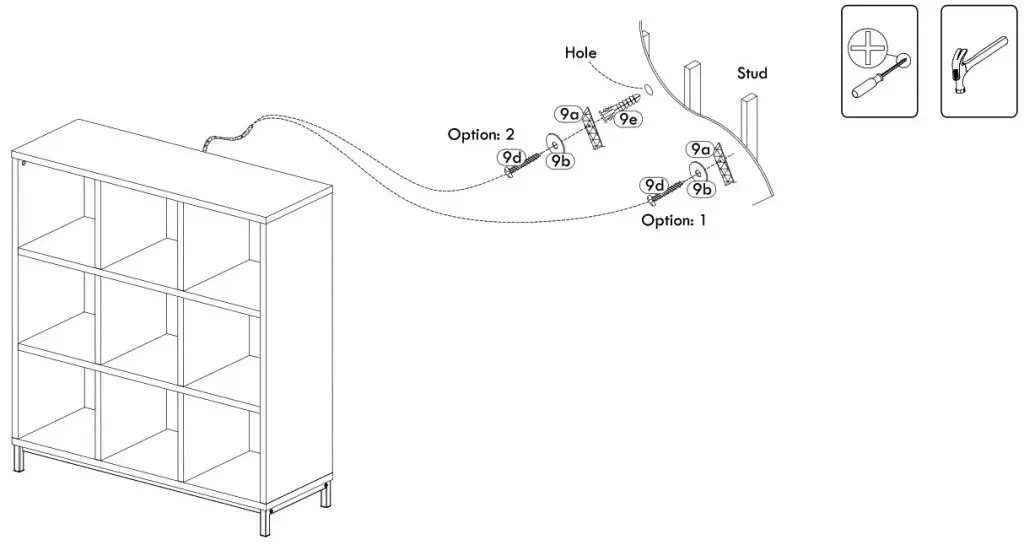 Option 1: Fasten the strap (9a) to a stud in the wall using the screw (9d) through the washer (9b).