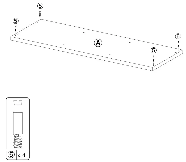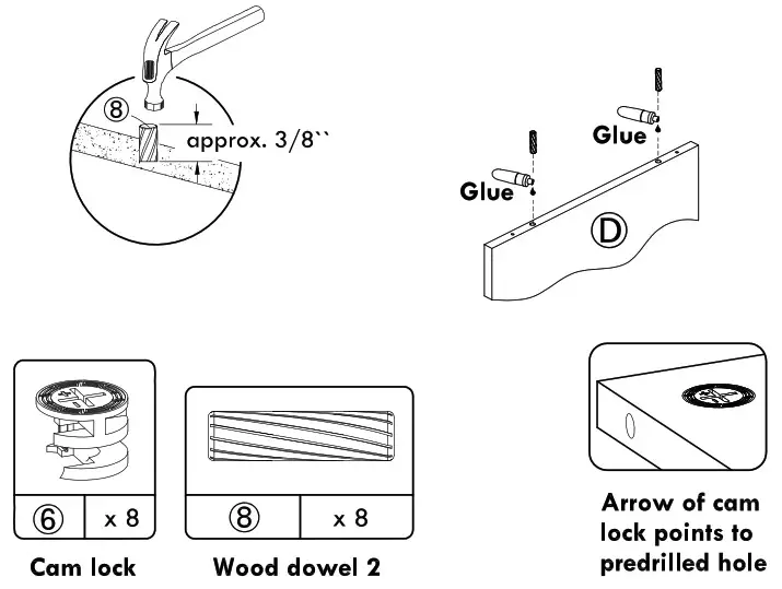 Warning! Additional glue for step 2. The glue needs to be put into the hole before inserting the wood dowel. - Screw-in the cam bolts into part A.