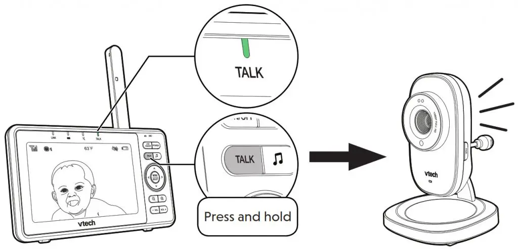 Press and hold TALK to speak to your parent unit. Your voice is transmitted to the baby unit.