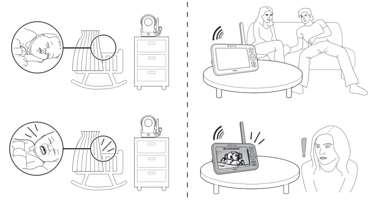 - Depending on the surroundings and other interfering factors, like lightings, objects, colors and backgrounds, the video quality may vary. Adjust the baby unit’s angle or place the baby unit at a higher level to prevent glare and blurry display.