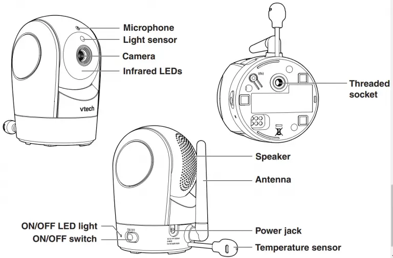 The baby unit has infrared LEDs that allow you to see your baby clearly at night or in a dark room. When the baby unit being viewed detects low light levels, the infrared LEDs are switched on automatically. The images from the baby unit are in black and white, and appears on the screen.