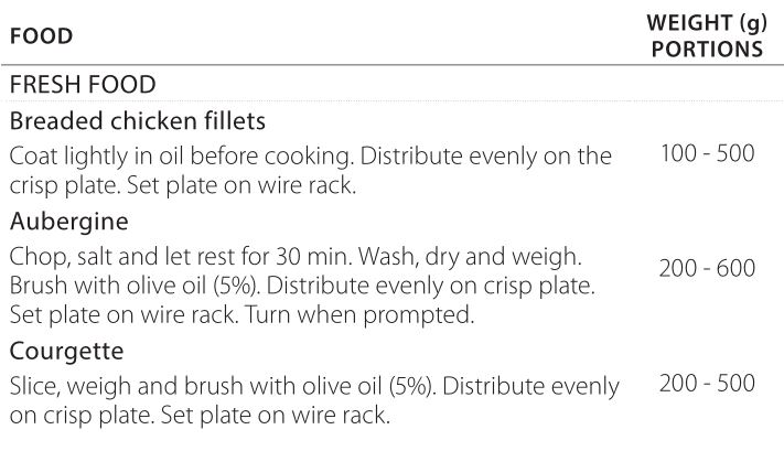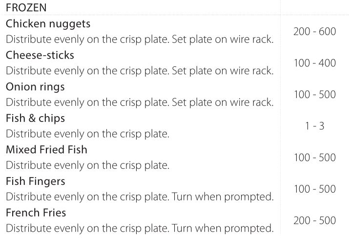 This healthy and exclusive function combines the quality of crisp  function with  the  properties of the warm air circulation. It allows crunchy, tasty frying results to be achieved, with a remarkable reduction of oil needed compared to the traditional way of cooking, even removing the need for oil in some recipes. It is possible fry a variety of preset foods, either fresh   or frozen. Follow the following table to use the accessories as indicated and obtain the best cooking results for each type of food (fresh or frozen).