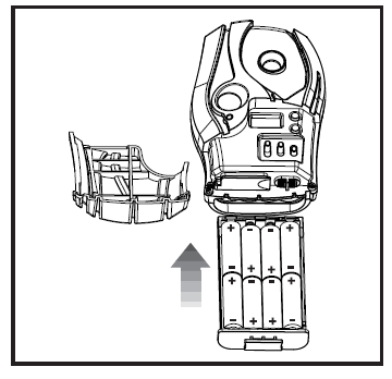 4. Push battery compartment in and slide the latch to the left (lacked icon) ta secure the batteries.