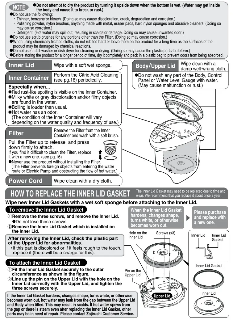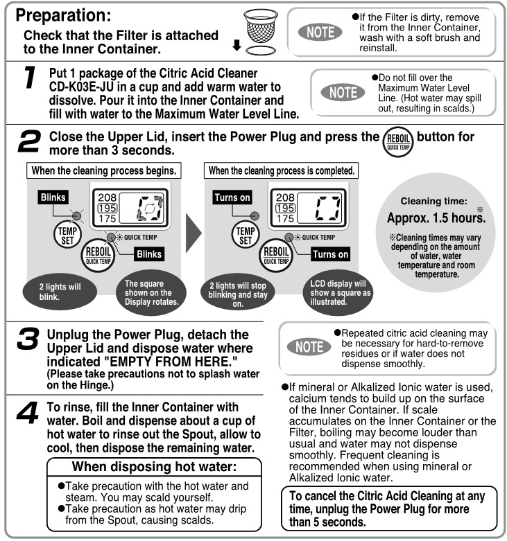 NOTE: In order to prevent gas bubbles and bubbling-over , the Citric Acid Cleaner for Electric Water Boilers (CD-K03E-JU) is recommended for cleaning . To purchase this cleaner, please visit an authorized Zojirushi dealer or www.zojirushi.com