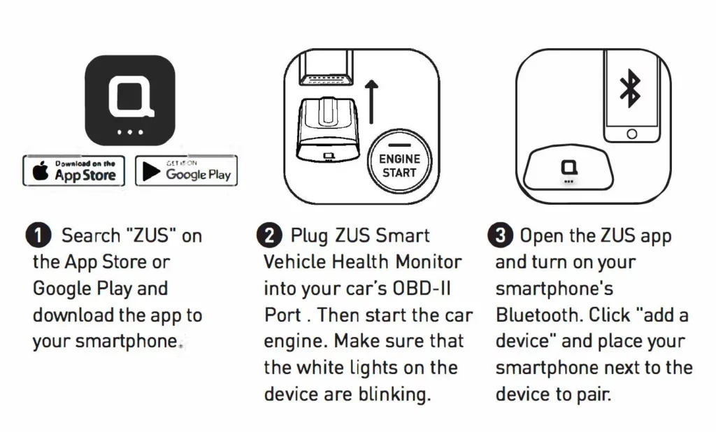 The ZUS OBD app is available from the Apple App Store and the Google Play Store. Using your Apple or Android device, go the app store and search for “ZUS”.